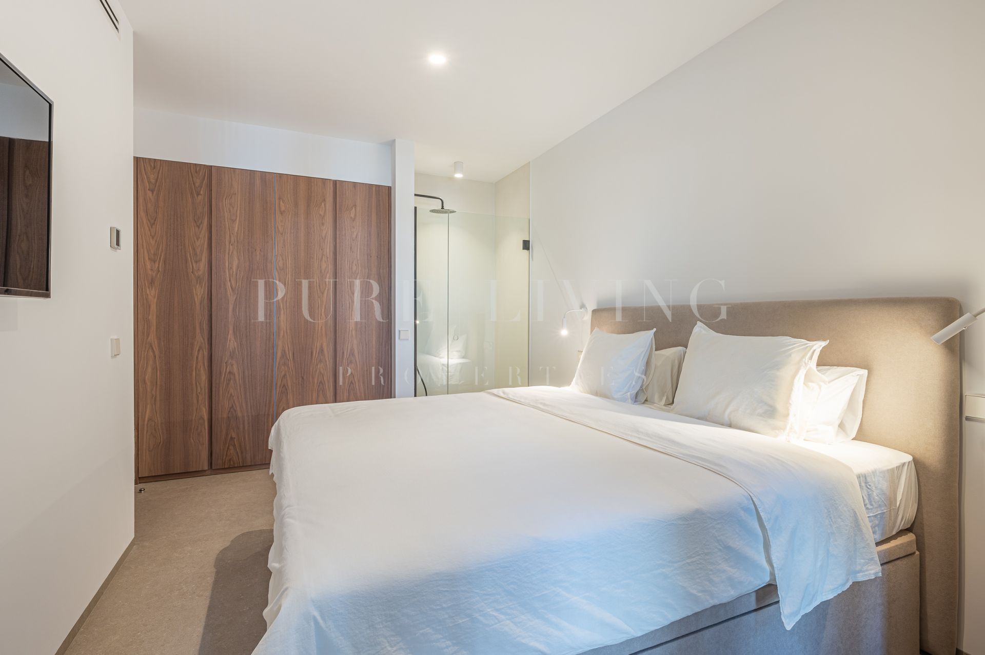Alle drie de slaapkamers zijn uitgerust met grote bedden van 180 cm en inbouwkasten, die voldoende opbergruimte bieden. De combinatie wasmachine-droger maakt de was een fluitje van een cent, terwijl het meubilair van BoConcept bijdraagt aan de algehele luxe van het appartement.
