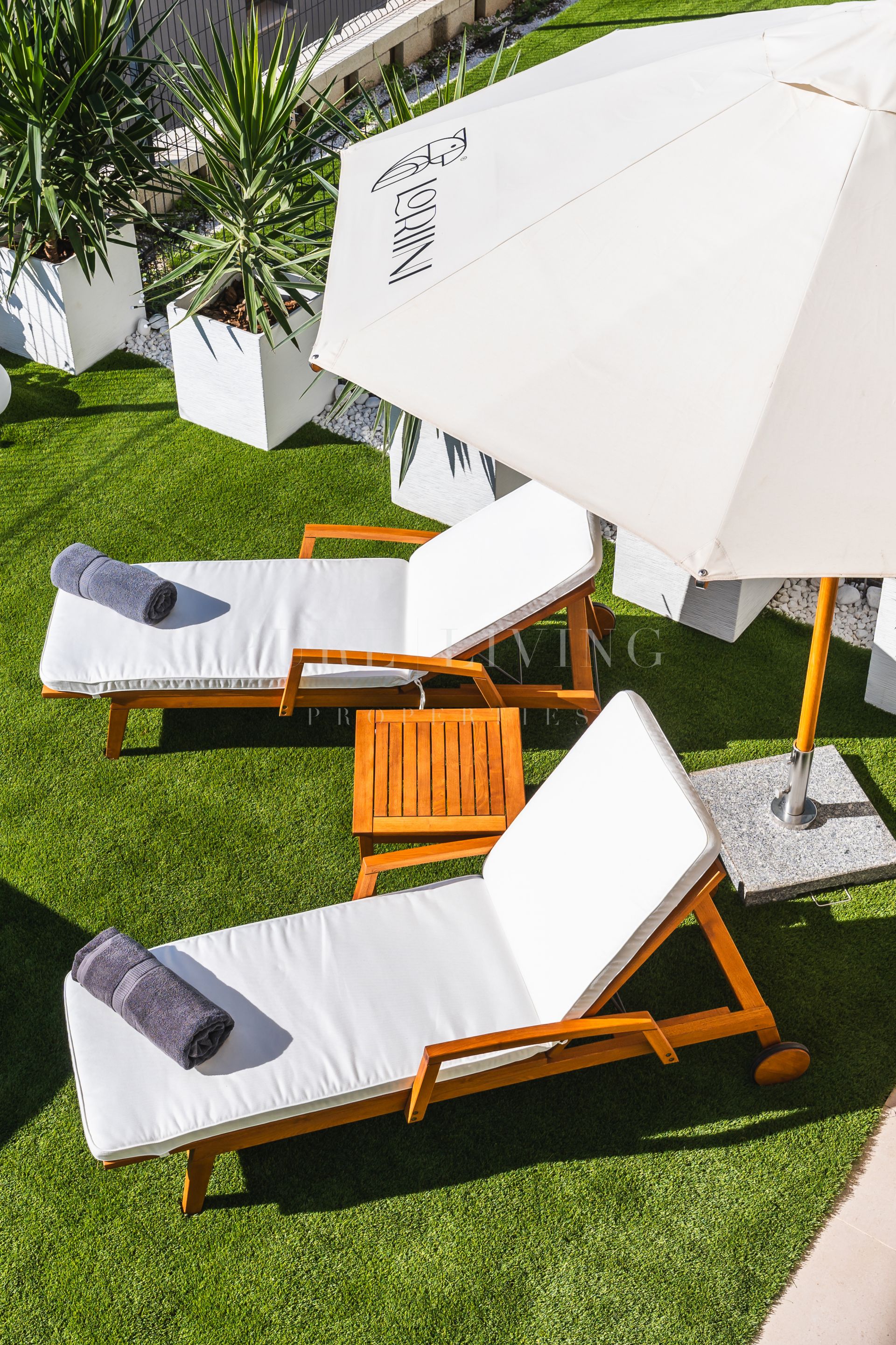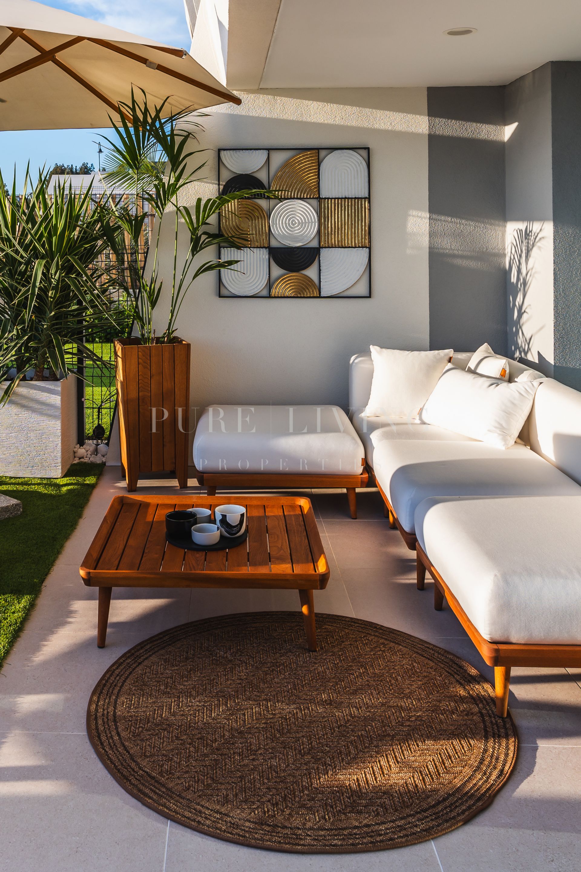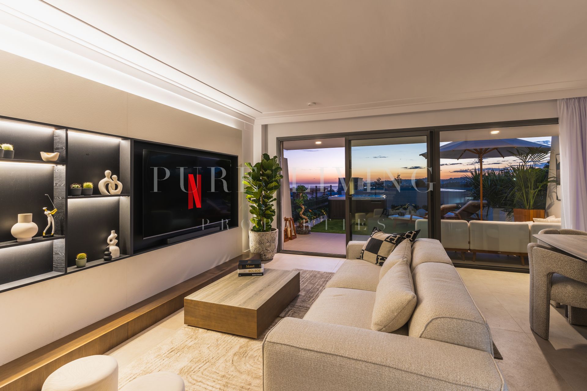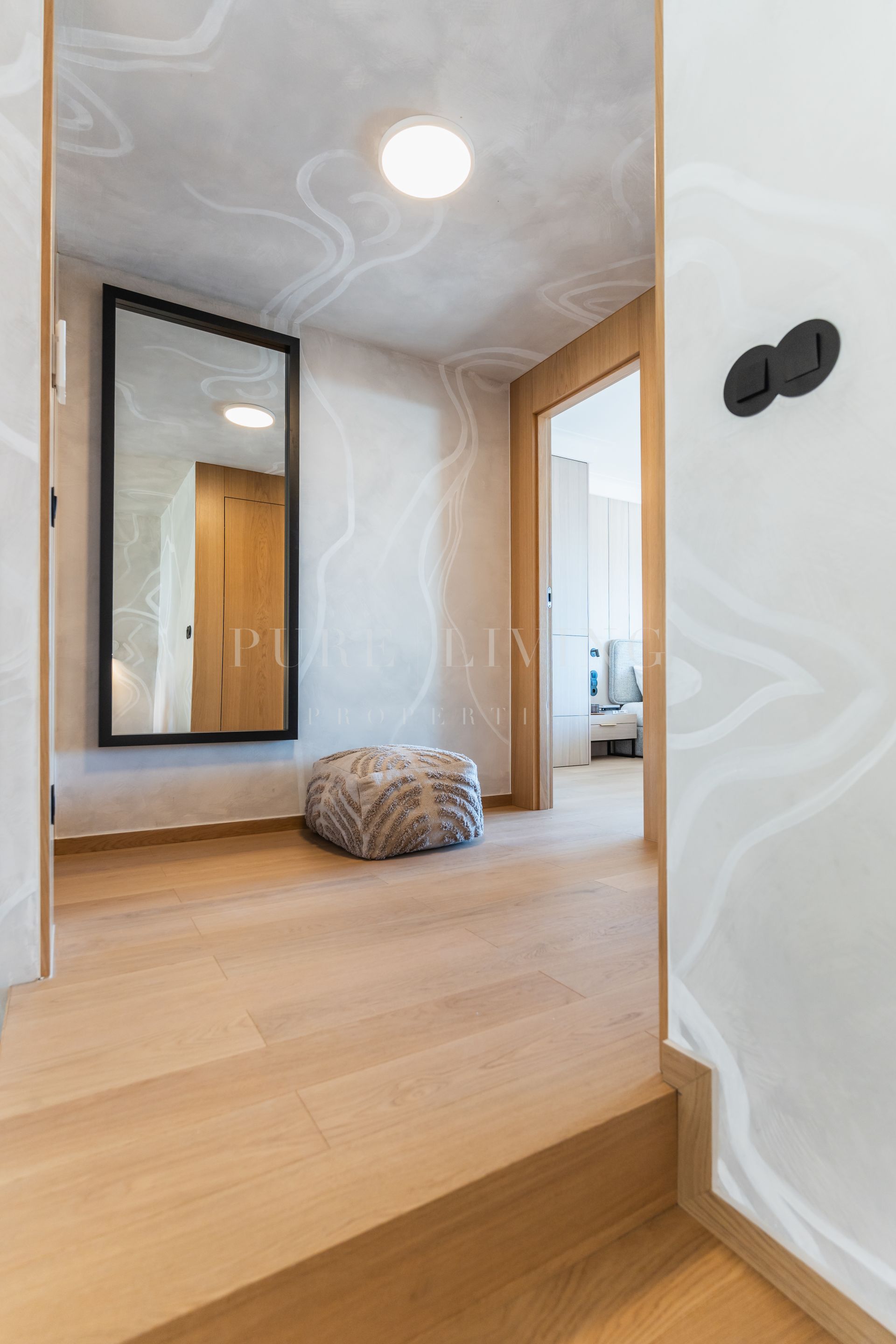 De afwerking in zachte, neutrale tinten, gecombineerd met porseleinen vloeren en hoogwaardig hout, onderstreept het luxe resortgevoel in de gehele woning.
