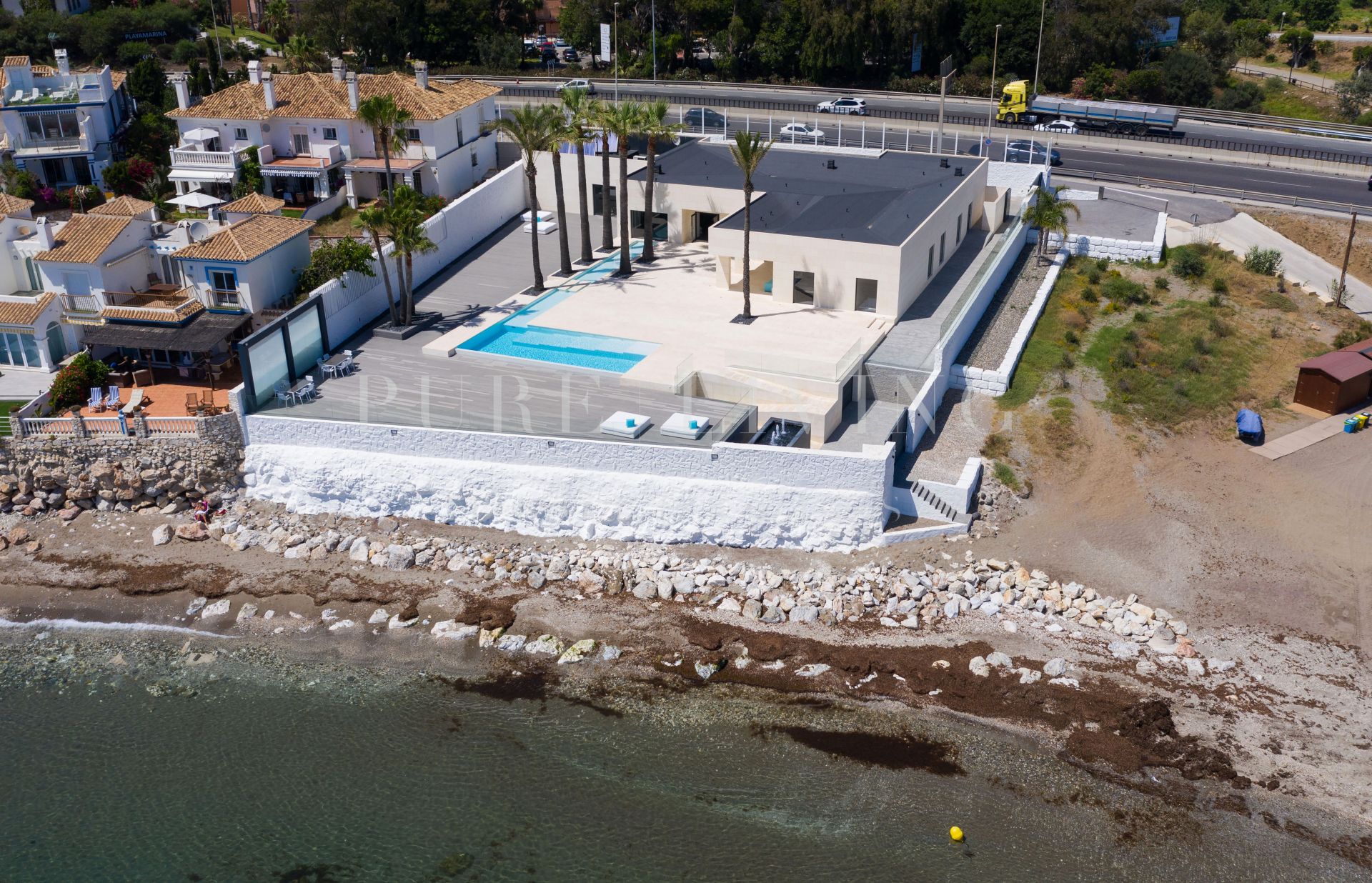 Welkom in deze prachtige villa op een steenworp afstand van de zee! Dit eigentijdse strandhuis staat op een zeer privé gelegen perceel van 2.190 m², in Mijas Costa. Deze op het zuiden gerichte villa is gebouwd op één niveau met 700 m² terrassen en heeft een adembenemend panoramisch uitzicht op zee vanuit bijna elke hoek.