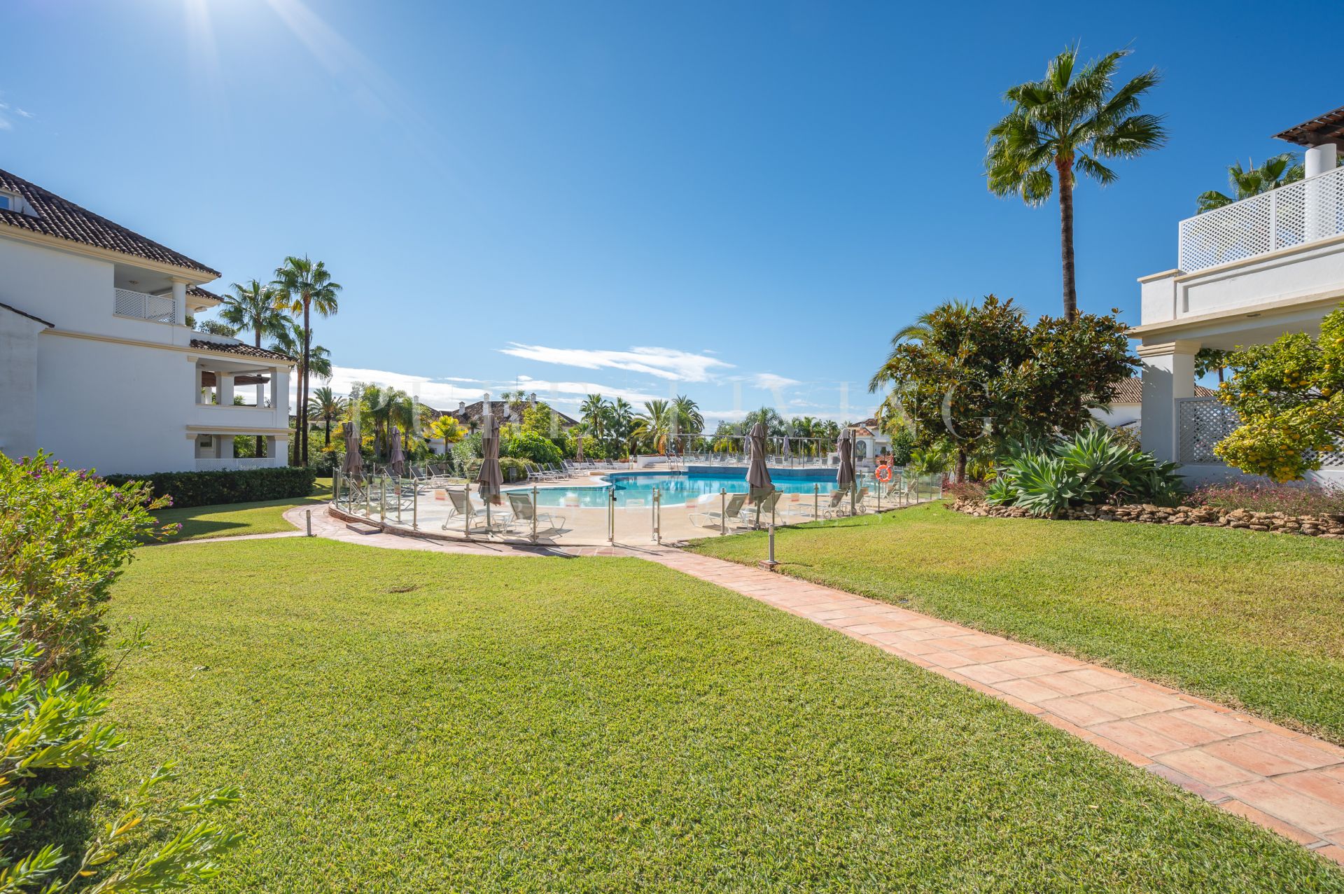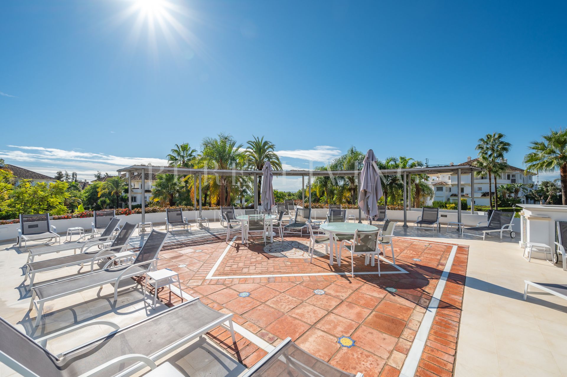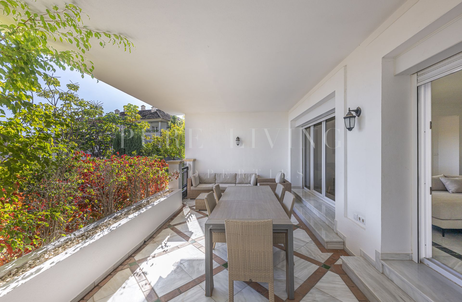 Het royale overdekte terras van 30 m², op het oosten gelegen en genietend van de ochtendzon, biedt directe toegang tot de prachtig onderhouden gemeenschappelijke tuinen, waardoor een naadloze binnen-buitenervaring ontstaat. Een van de buitenzwembaden van de wijk is gunstig gelegen vlak voor het gebouw, terwijl de belangrijkste gemeenschappelijke ruimte – met een volledig gerenoveerde spa, een verwarmd binnenzwembad en een fitnessruimte – op slechts drie minuten lopen ligt.