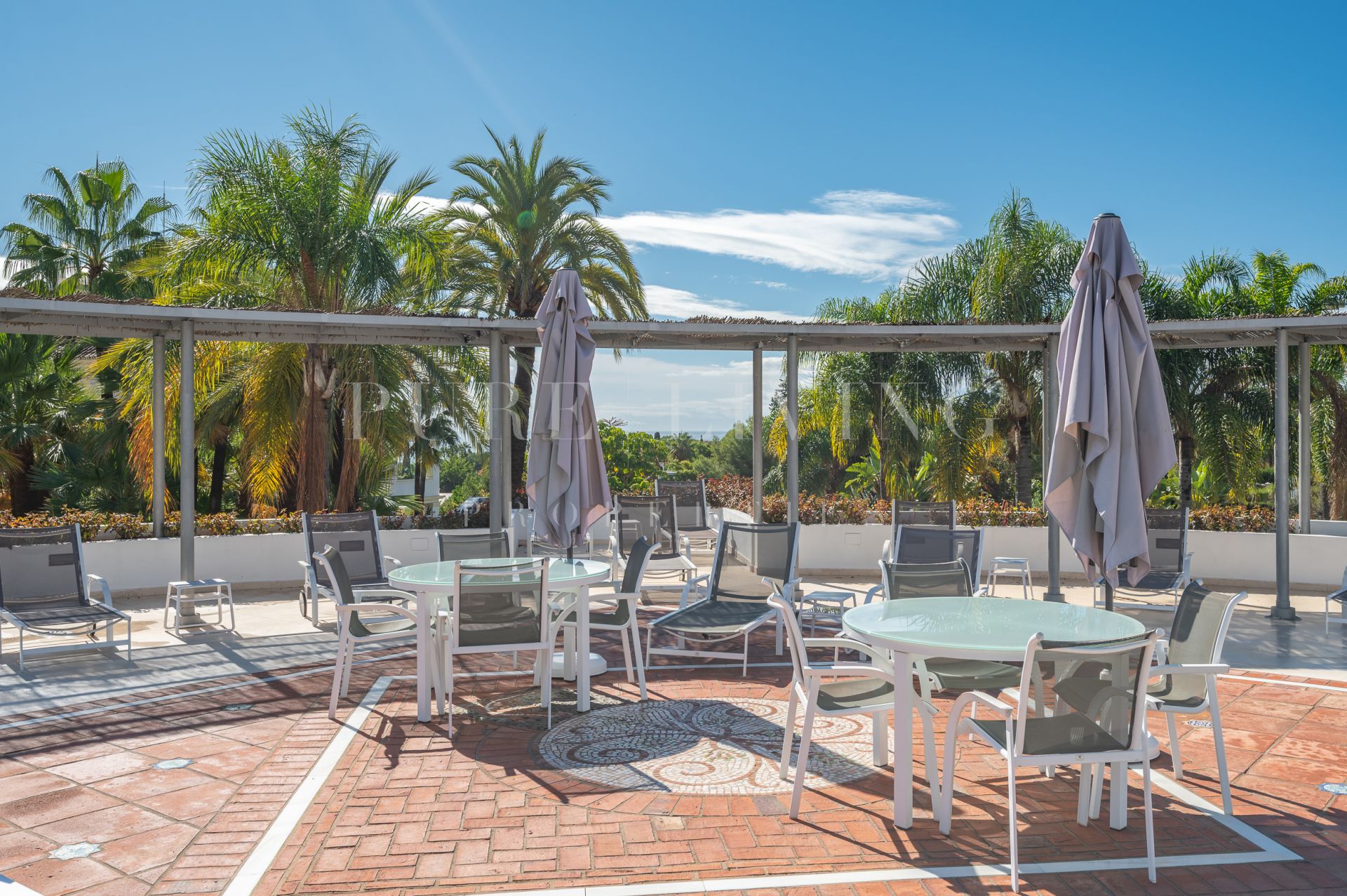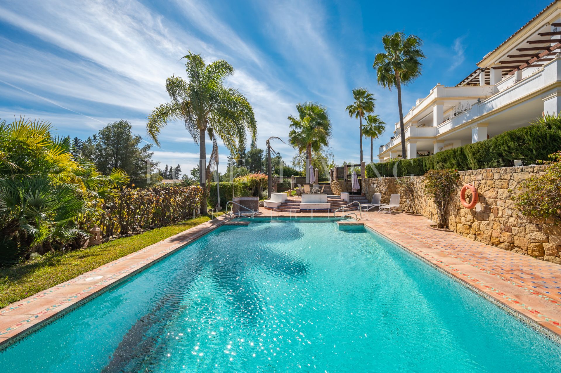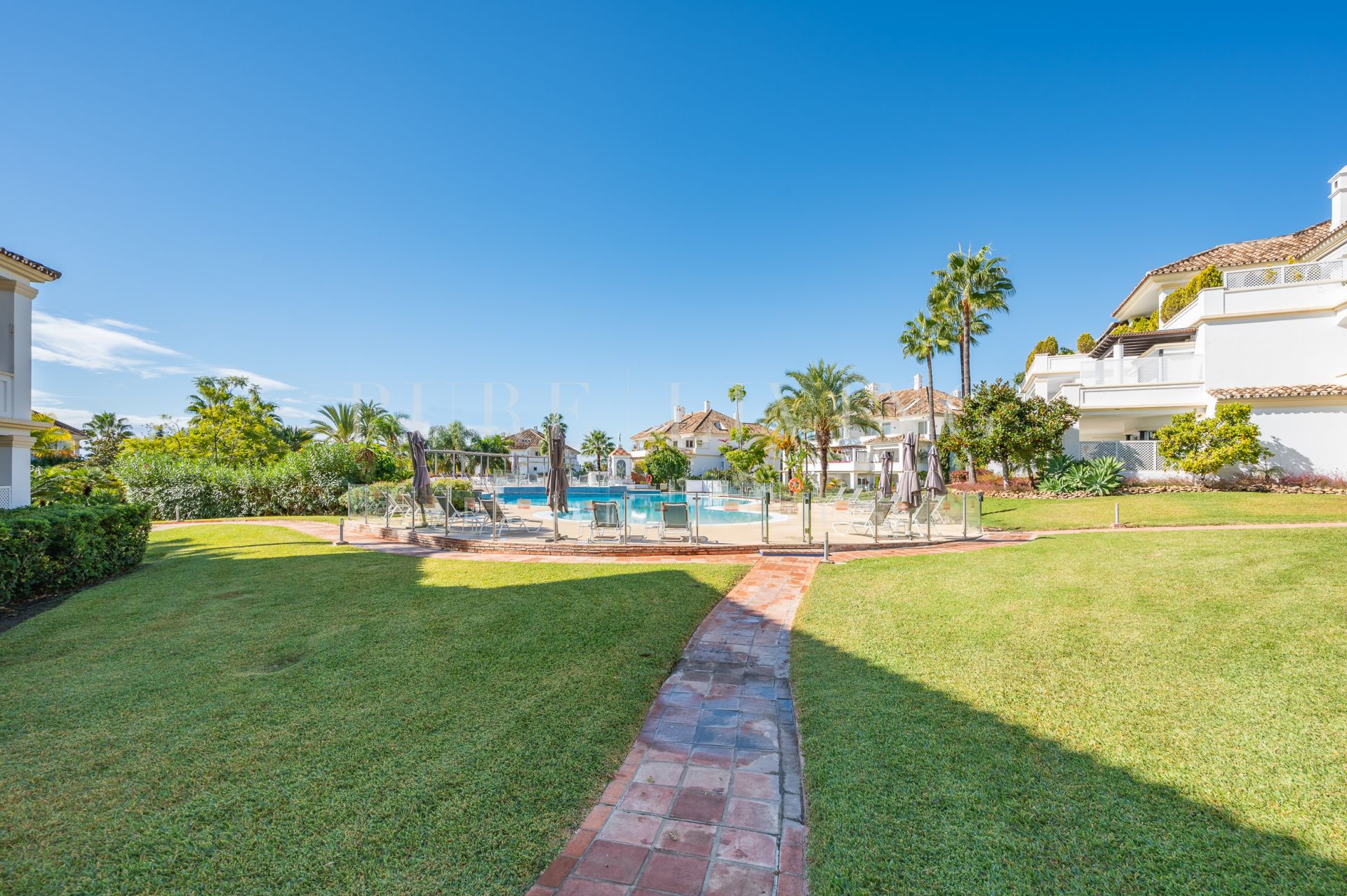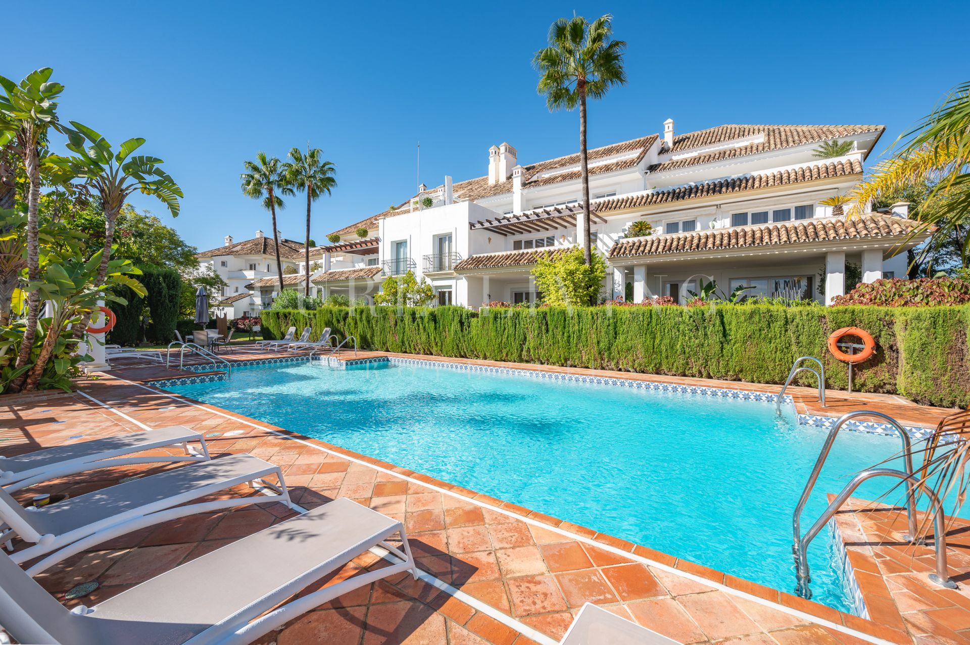 Het royale overdekte terras van 30 m², op het oosten gelegen en genietend van de ochtendzon, biedt directe toegang tot de prachtig onderhouden gemeenschappelijke tuinen, waardoor een naadloze binnen-buitenervaring ontstaat. Een van de buitenzwembaden van de wijk is gunstig gelegen vlak voor het gebouw, terwijl de belangrijkste gemeenschappelijke ruimte – met een volledig gerenoveerde spa, een verwarmd binnenzwembad en een fitnessruimte – op slechts drie minuten lopen ligt.