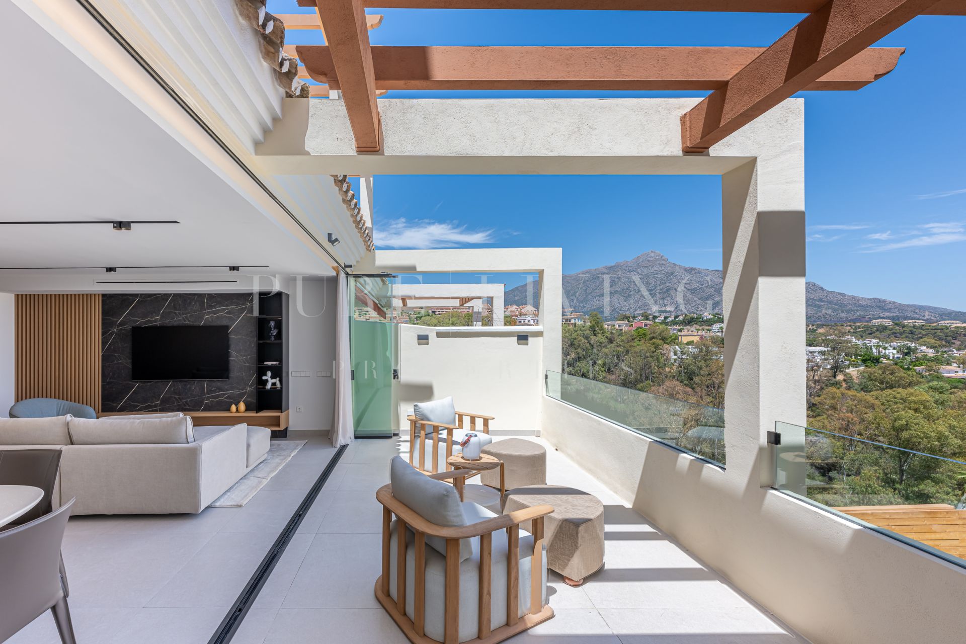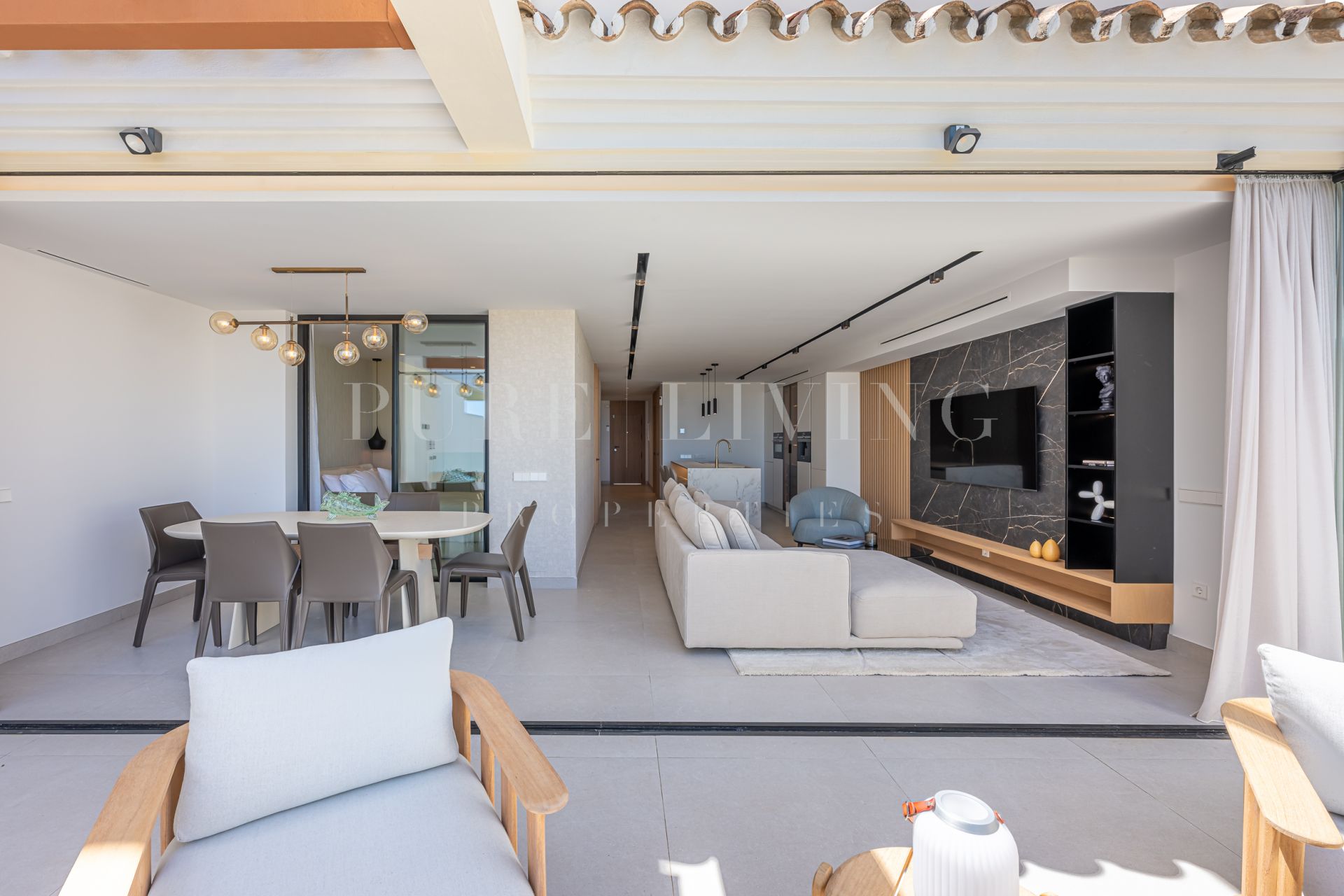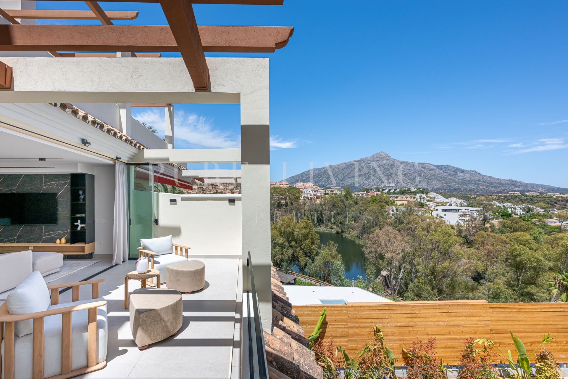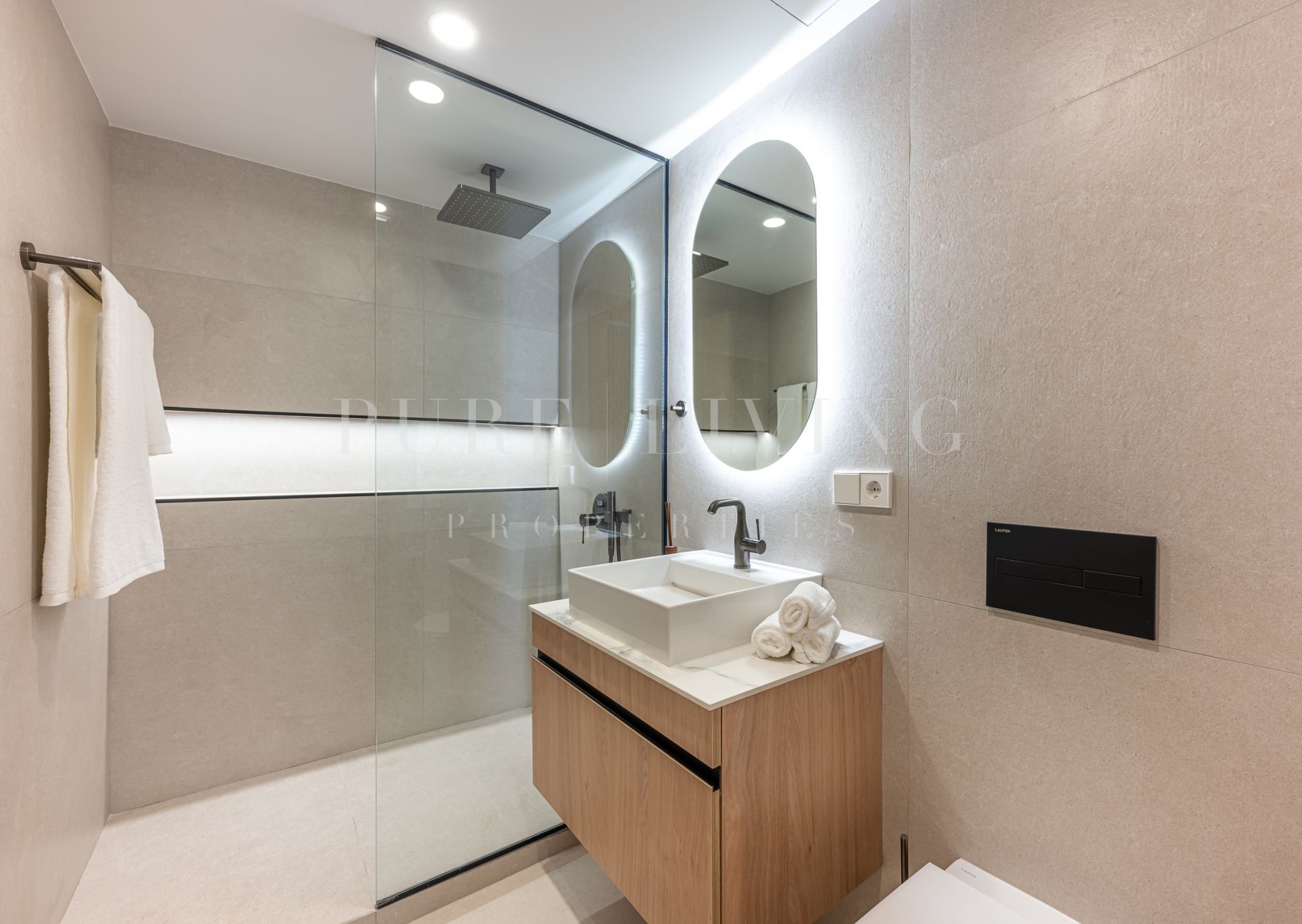 Ontdek dit prachtige appartement met drie slaapkamers, perfect gelegen in het prestigieuze Palacetes Los Belvederes. Geniet van het adembenemende uitzicht op de zee, het meer en de iconische berg La Concha vanuit deze prachtig gerenoveerde woning.