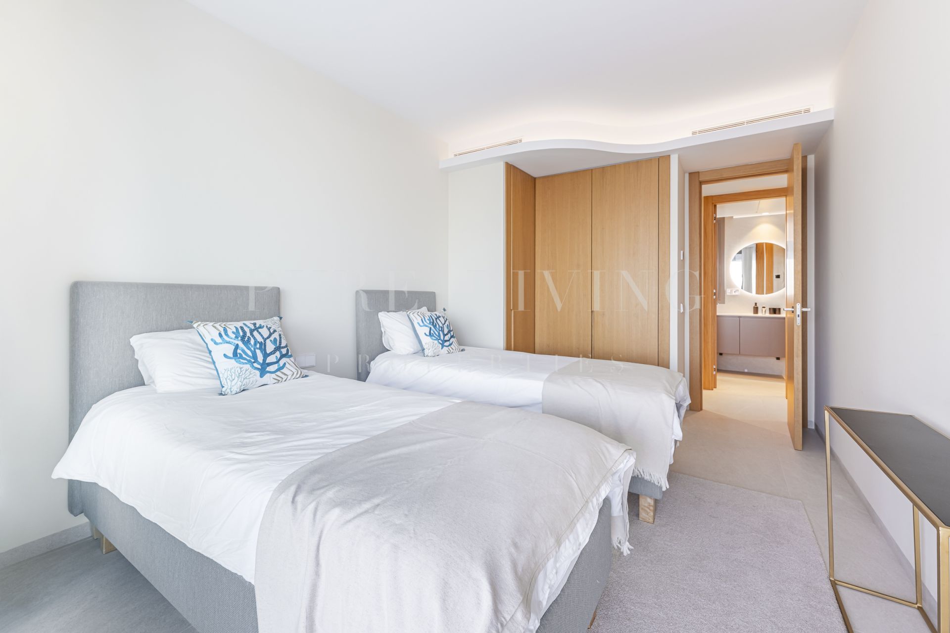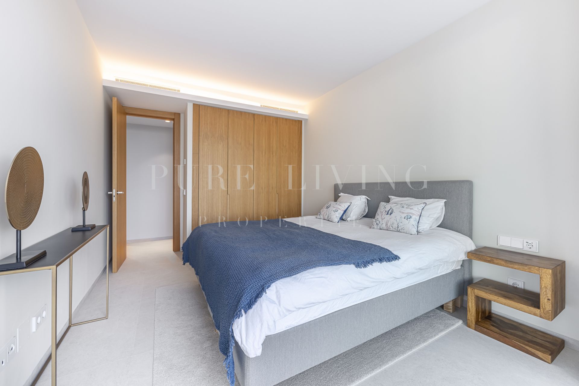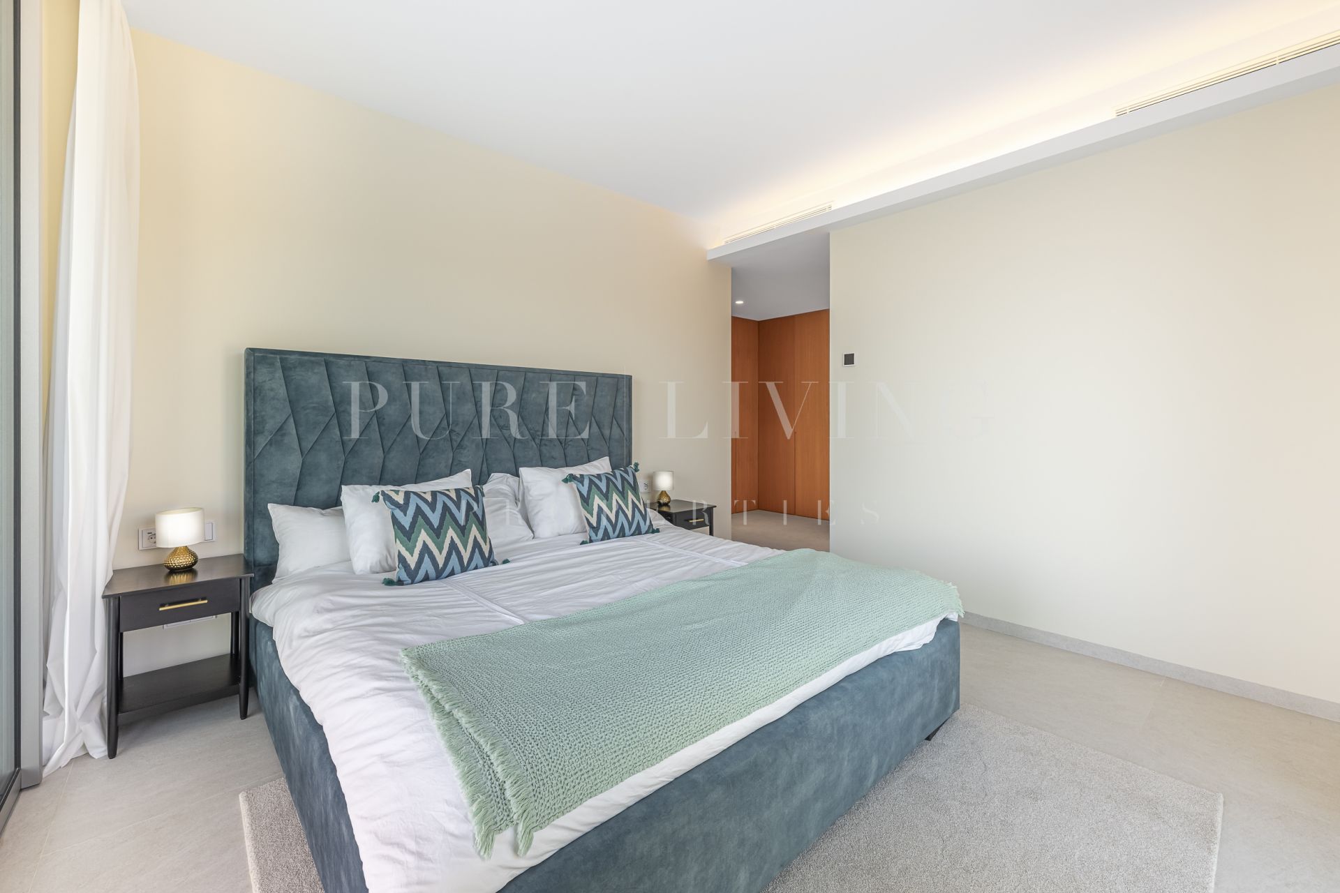 De drie slaapkamers zijn ontworpen voor comfort en privacy, met uitzicht vanuit elke kamer dat het gevoel van licht en openheid versterkt. Aan elk detail is gedacht om maximaal comfort te garanderen: zone-gestuurde airconditioning, vloerverwarming in de badkamers en hoogwaardige afwerkingen. Een ondergrondse parkeerplaats en aparte berging zorgen voor extra gemak.