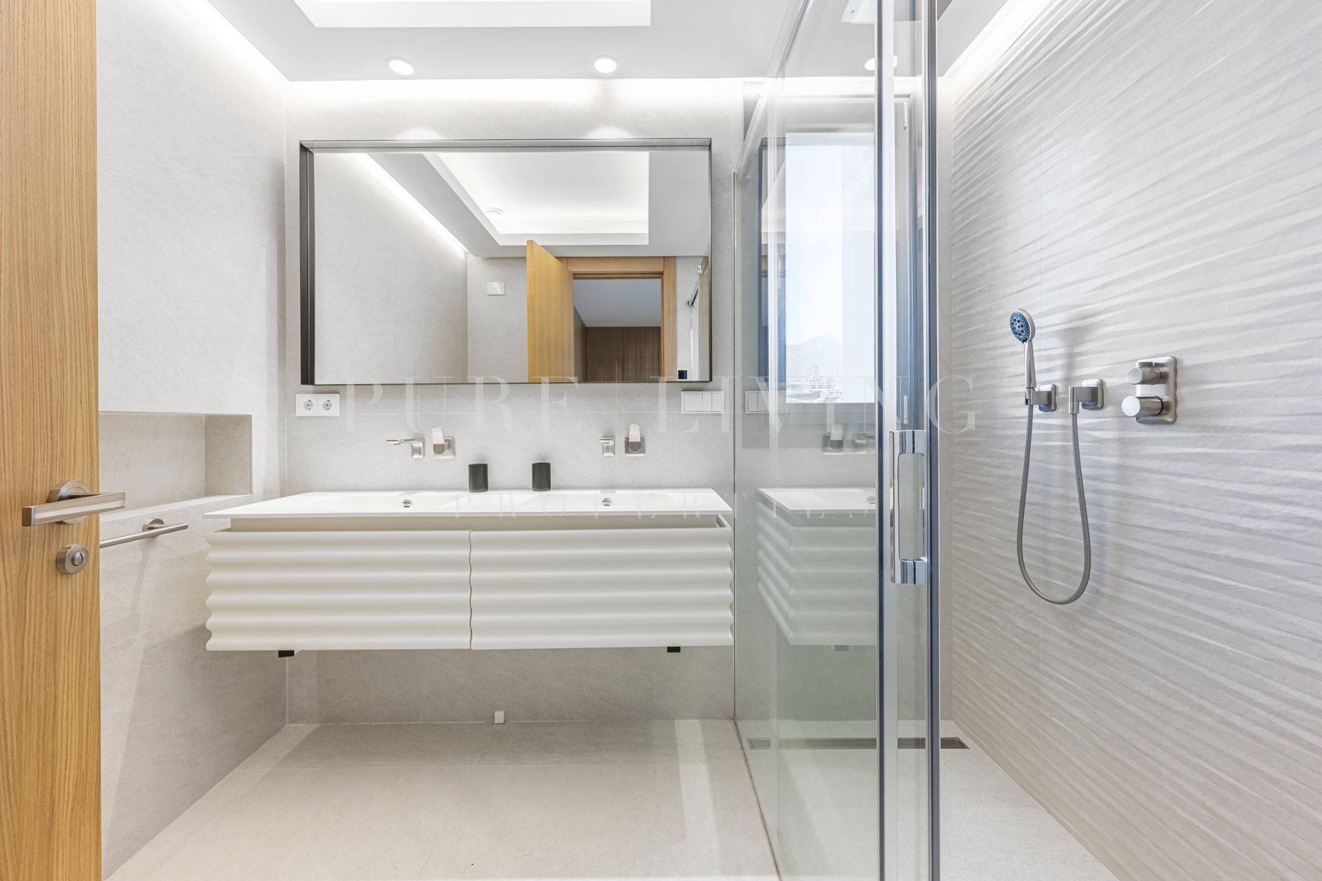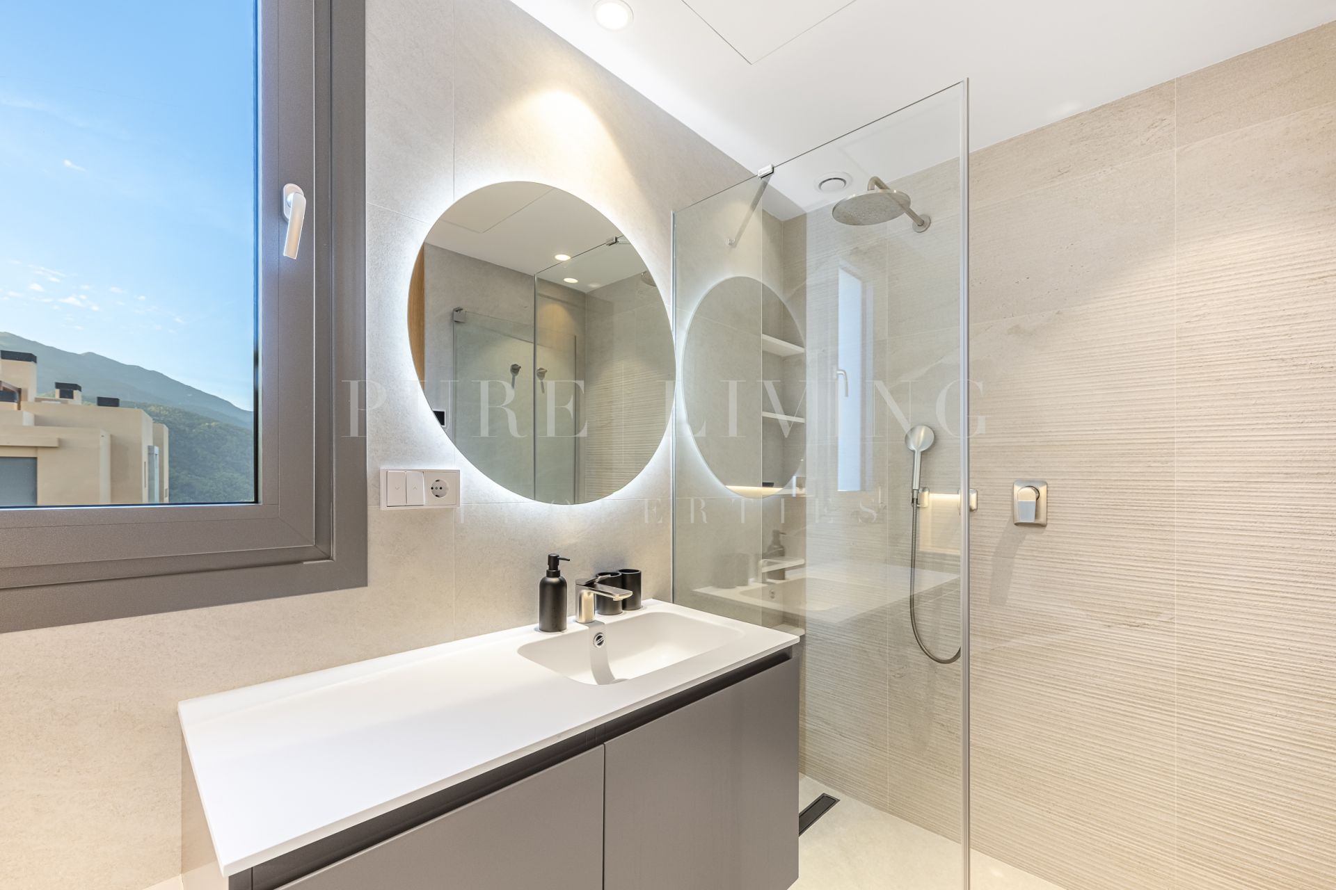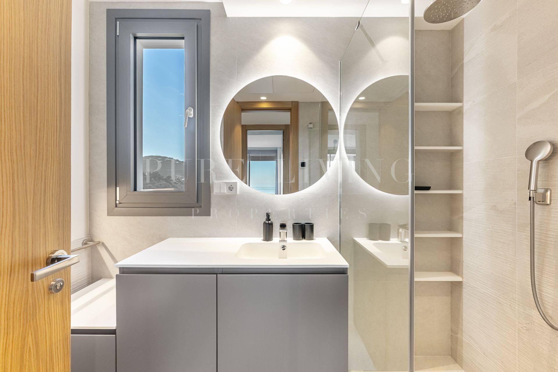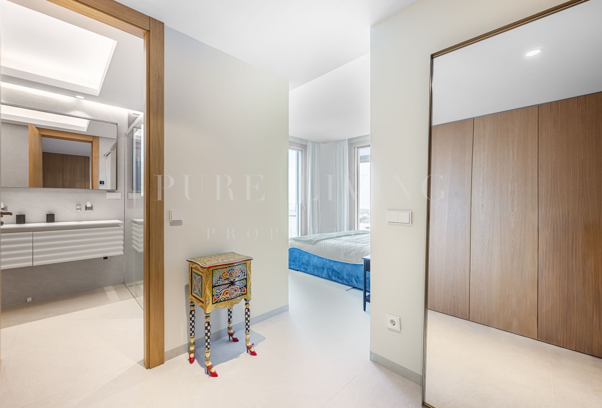De drie slaapkamers zijn ontworpen voor comfort en privacy, met uitzicht vanuit elke kamer dat het gevoel van licht en openheid versterkt. Aan elk detail is gedacht om maximaal comfort te garanderen: zone-gestuurde airconditioning, vloerverwarming in de badkamers en hoogwaardige afwerkingen. Een ondergrondse parkeerplaats en aparte berging zorgen voor extra gemak.
