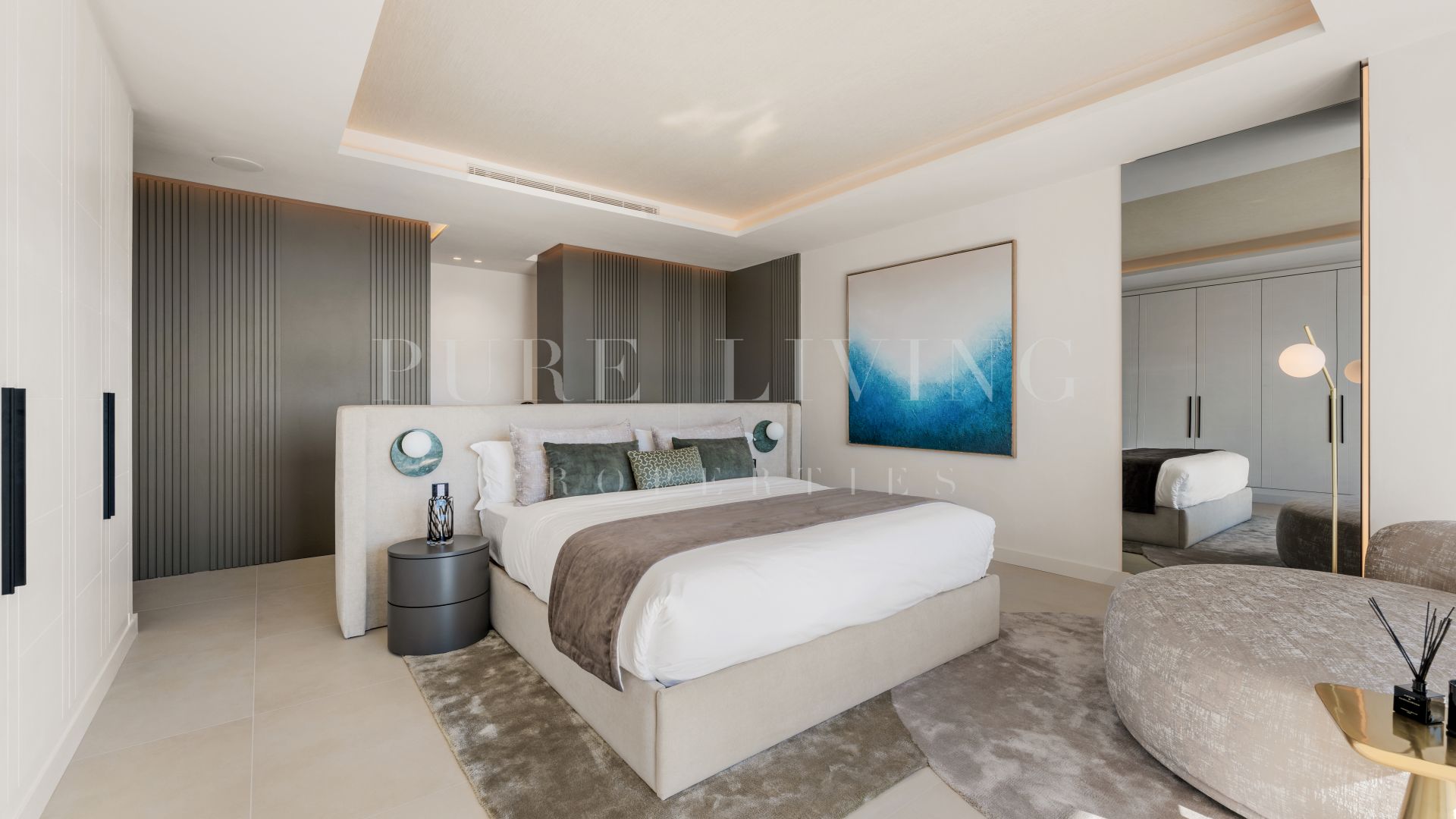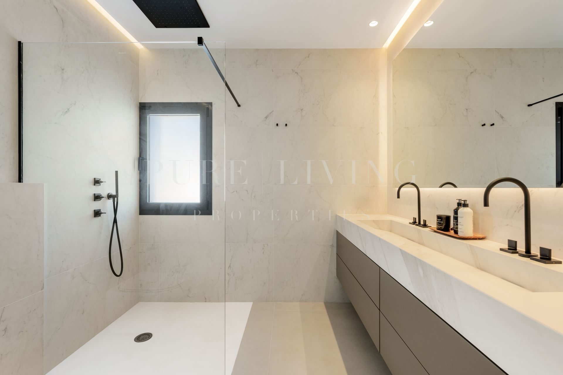 Boven delen drie slaapkamers de toegang tot een spectaculair terras – de kroon op de villa. Hier strekt zich een panoramisch uitzicht uit over de kustlijn van Marbella en de Middellandse Zee. Op heldere dagen reikt het uitzicht tot aan Gibraltar, de Afrikaanse kust, Cádiz en Tarifa. Het is de perfecte plek voor een kopje koffie in de ochtend of een glas wijn in de avond, terwijl de horizon de tijdloze allure van de Zuilen van Hercules oproept. De master suite is bijzonder indrukwekkend en combineert luxe en warmte met een eigen badkamer, terwijl alle badkamers in de villa zijn voorzien van hoogwaardige materialen en een eigentijds design.
