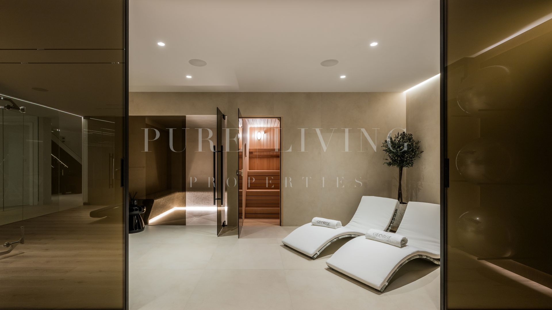 Het lagere niveau biedt ruimtes die zijn gewijd aan ontspanning en entertainment: een sauna, hamam, fitnessruimte, kleine wijnkelder en een extra gastenslaapkamer met badkamer. Zelfs de garage, met zijn glazen deur, weerspiegelt de doordachte benadering van de villa op het gebied van licht, openheid en stijl.
